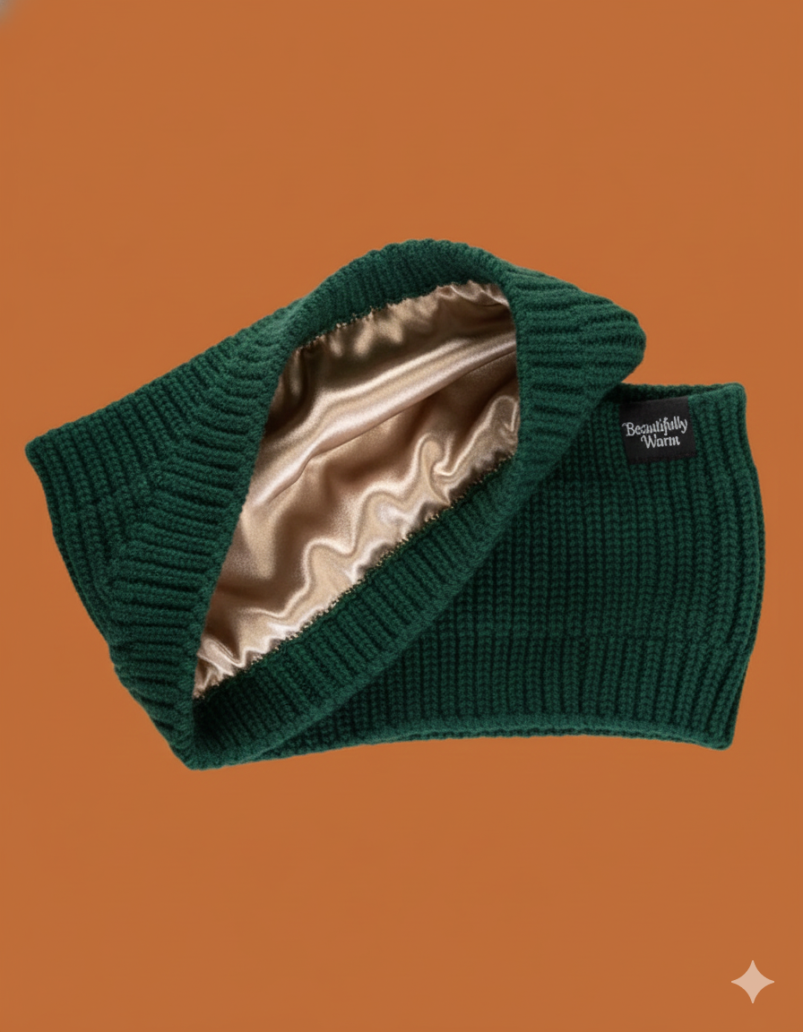 The ultimate solution for cold-weather style and hair health. Our Beautifully Warm Thermal Knit Satin-Lined Headband is engineered for the outdoor adventurer who refuses to compromise on hair integrity. Featuring a classic Forest Green exterior that blends seamlessly with any outdoor gear, this headband ensures your crown is protected from friction and cold, from the trail to the town.